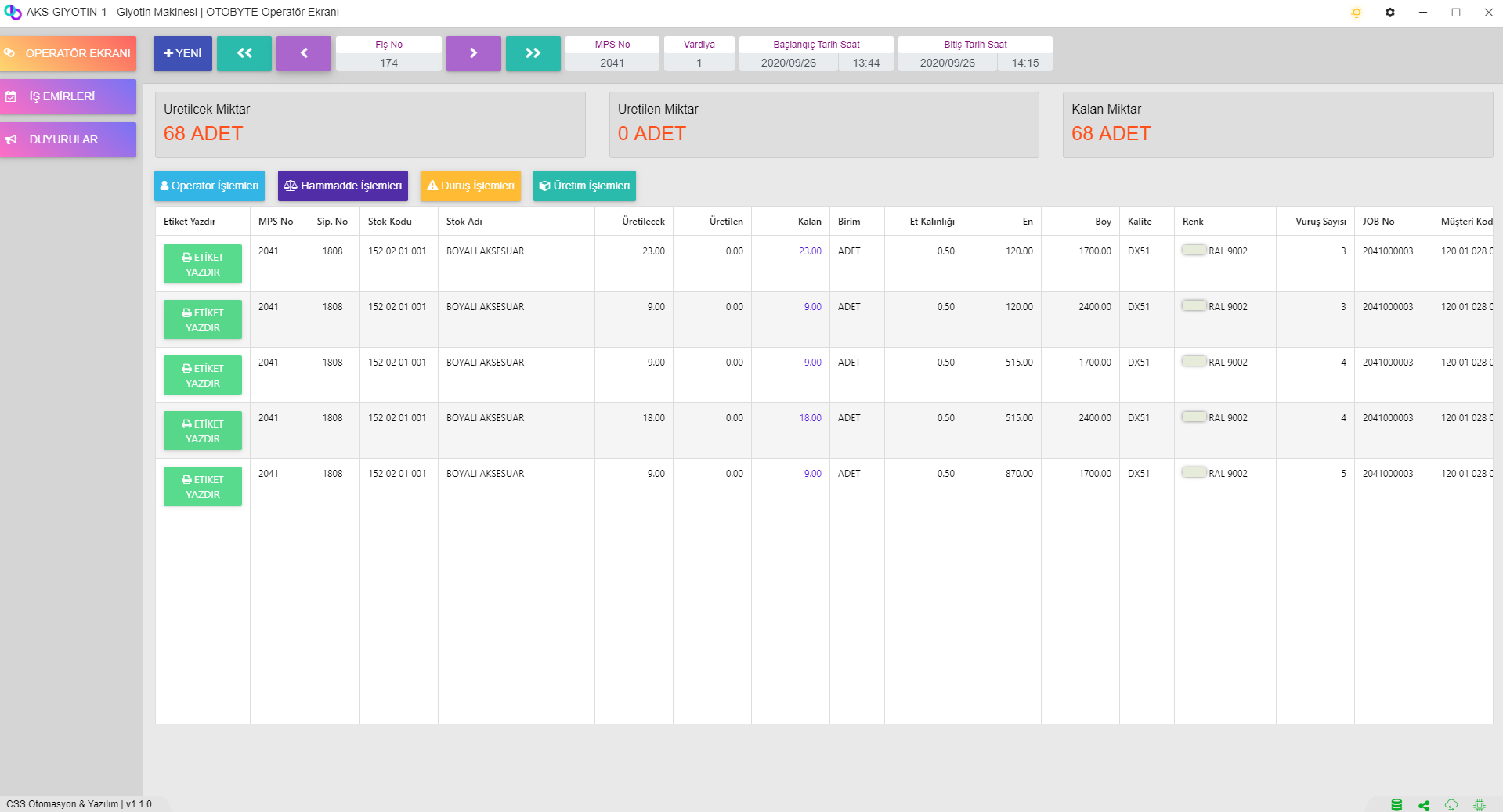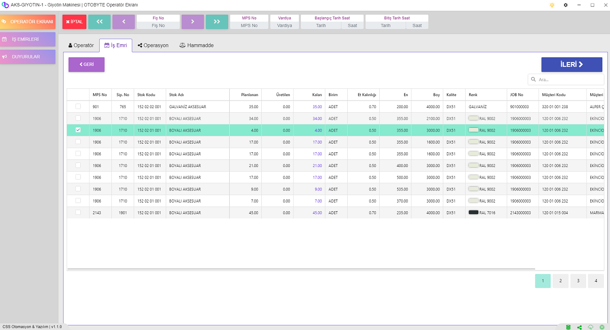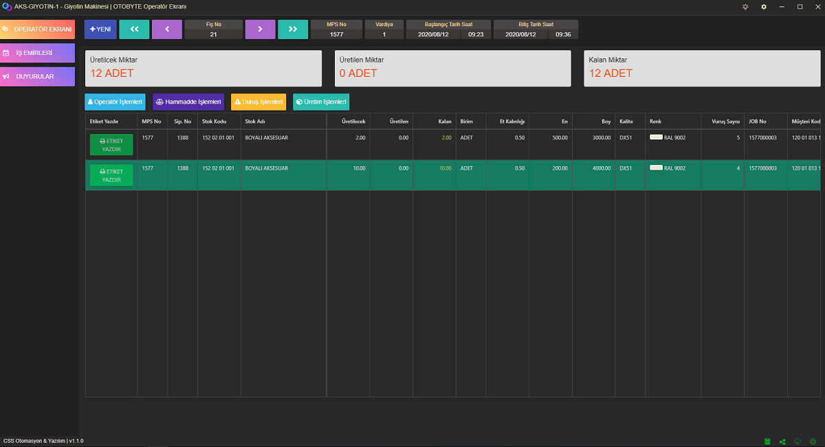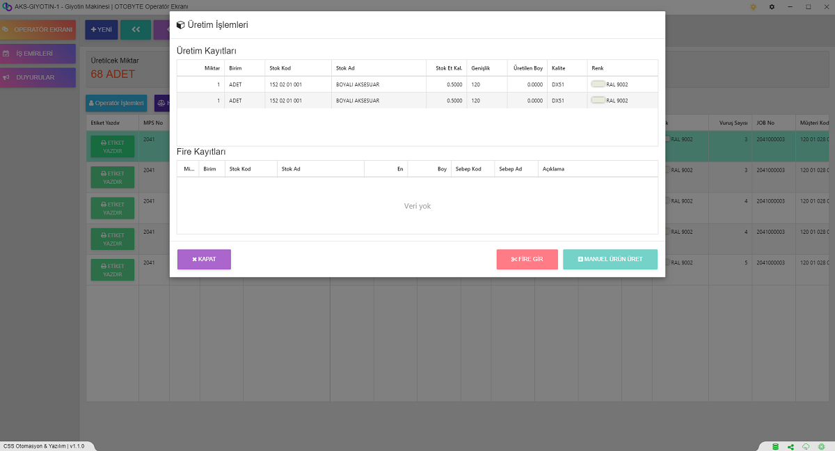 Makinelerin Çalışma Süreleri Duruş süreleri Sebepleri gibi Bütün Veriler Kayıt Altına alınıp Hem Geçmiş Olarak Görüntülenebilmekte Hemde Rapor Olarak Sunulmaktadır.Operatör Her İş Yaptığı Makineye İş Emrini Kendini Operatör Olarak Eklemek Zorundadır.Böylelikle Uygulama Tarih,Saat ve Süre Olarak Hangi Makinede Ne kadar Çalıştığını Takip Edebilmektedir. Ayrıca Girilen Duruşlar ile de Operatörün Performans Analizi ve Makinanın Performans Analizi Yapılabilmektedir.